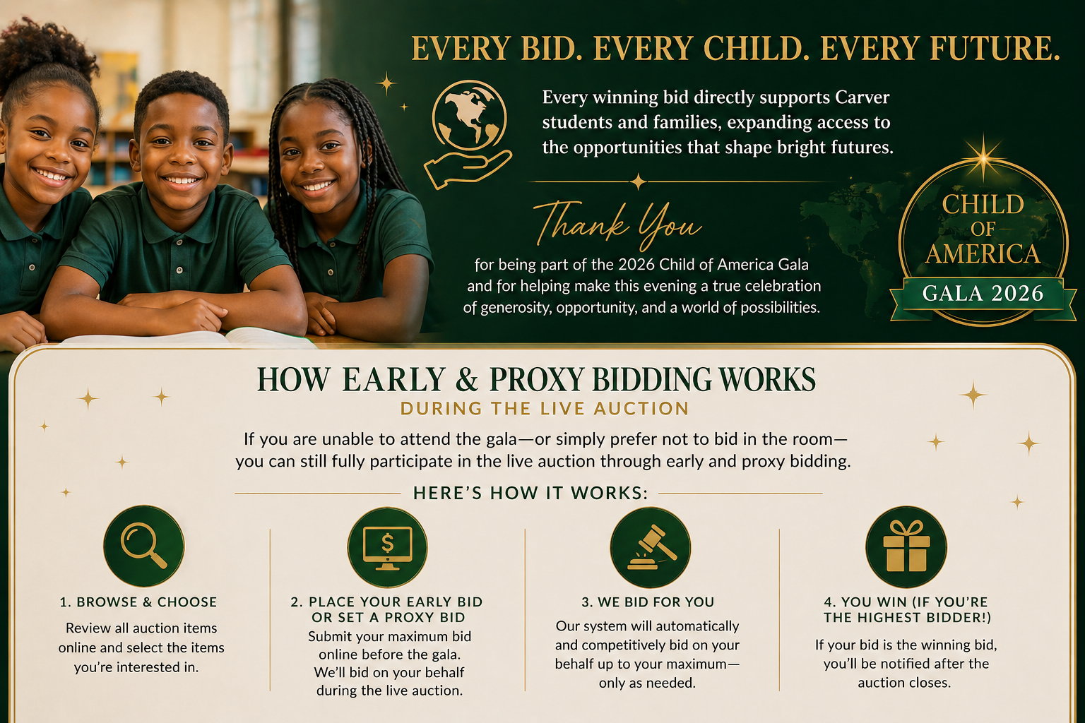 Every winning bid directly supports Carver students and families, expanding access to the opportunities that shape bright futures. Thank you for being part of the 2026 Child of America Gala and for helping make this evening a true celebration of generosity, opportunity, and a world of possibilities.