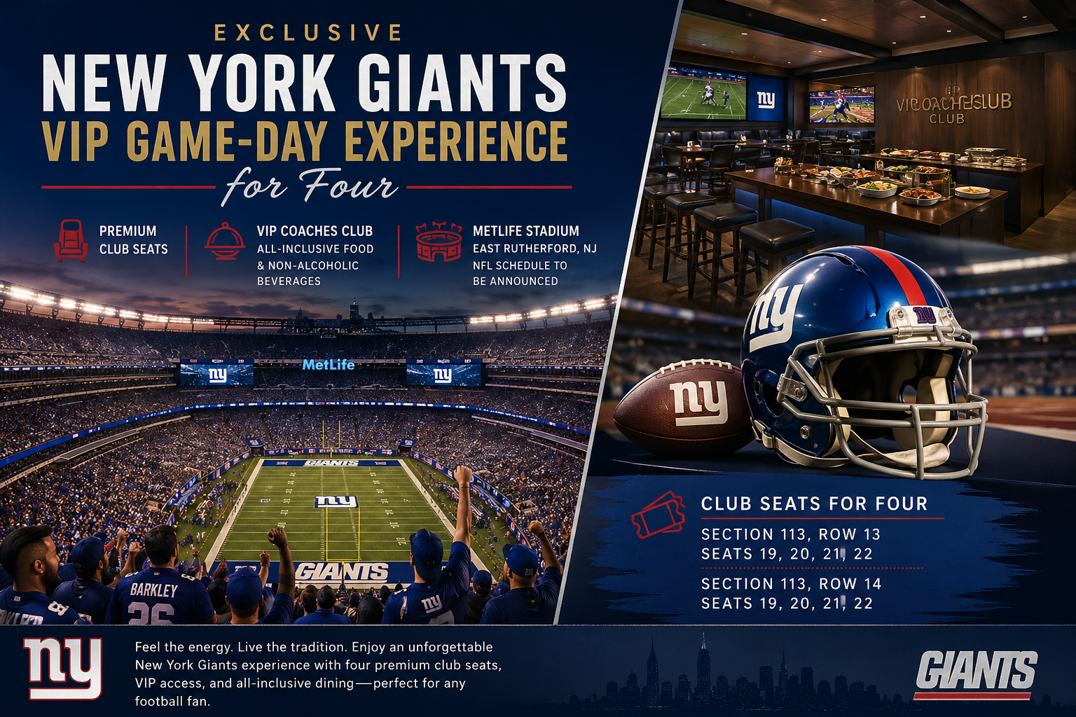 Experience the thrill of NFL football in style with four premium club seats at MetLife Stadium in East Rutherford. This exclusive package includes access to the VIP Coaches Club, featuring all-inclusive food and non-alcoholic beverages in a private, upscale setting.
