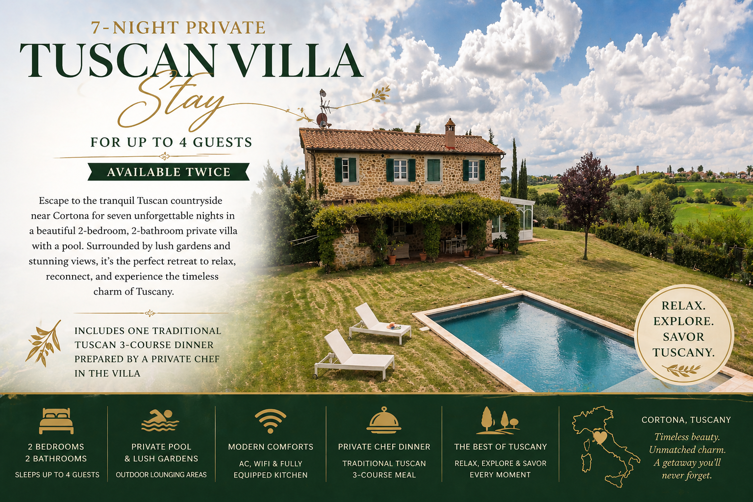 • Includes one in-villa traditional three-course Tuscan dinner by a private chef