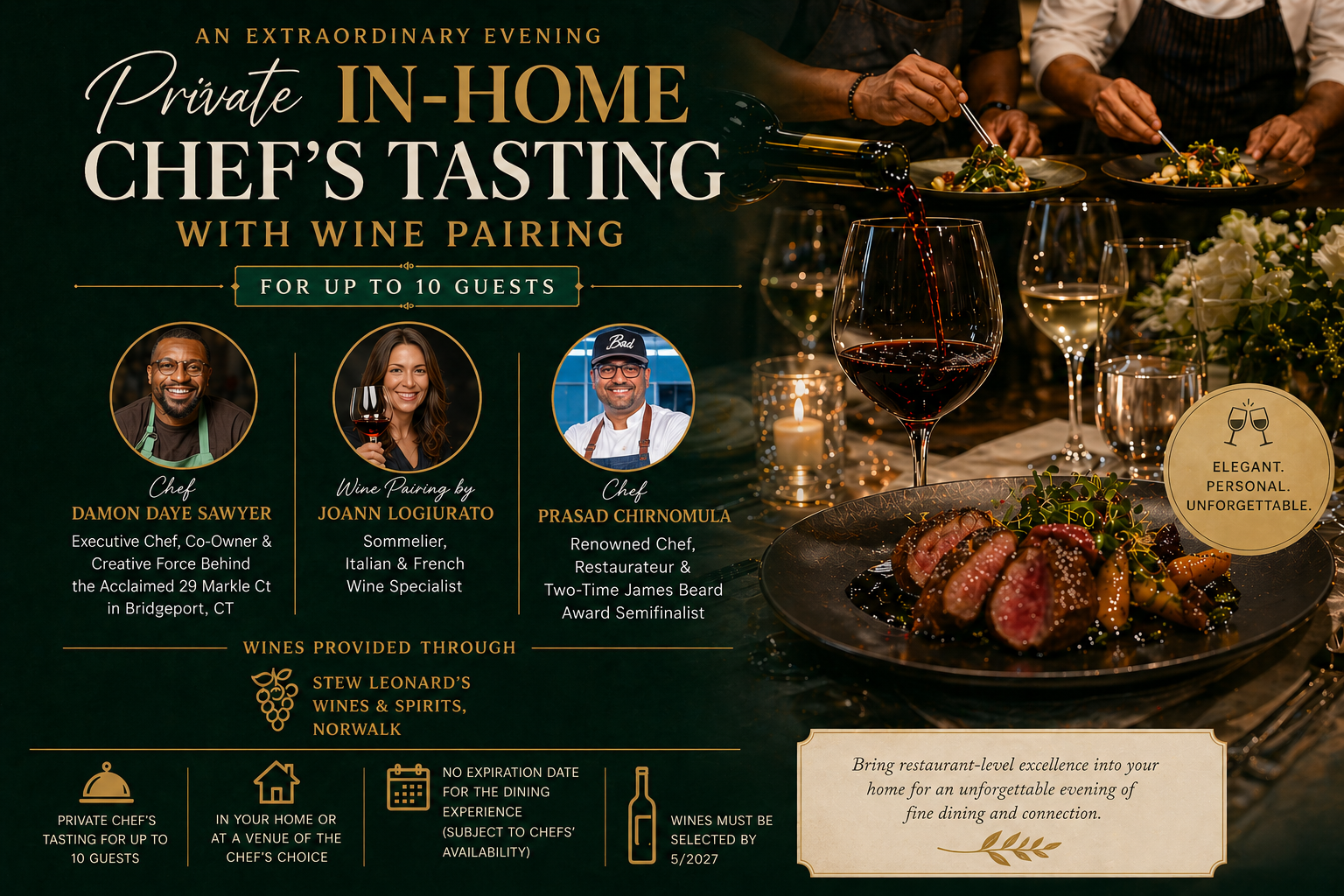 Elegant, intimate, and highly personalized, this experience offers a rare opportunity to bring restaurant-level excellence into a private setting for an unforgettable night of fine dining and connection.