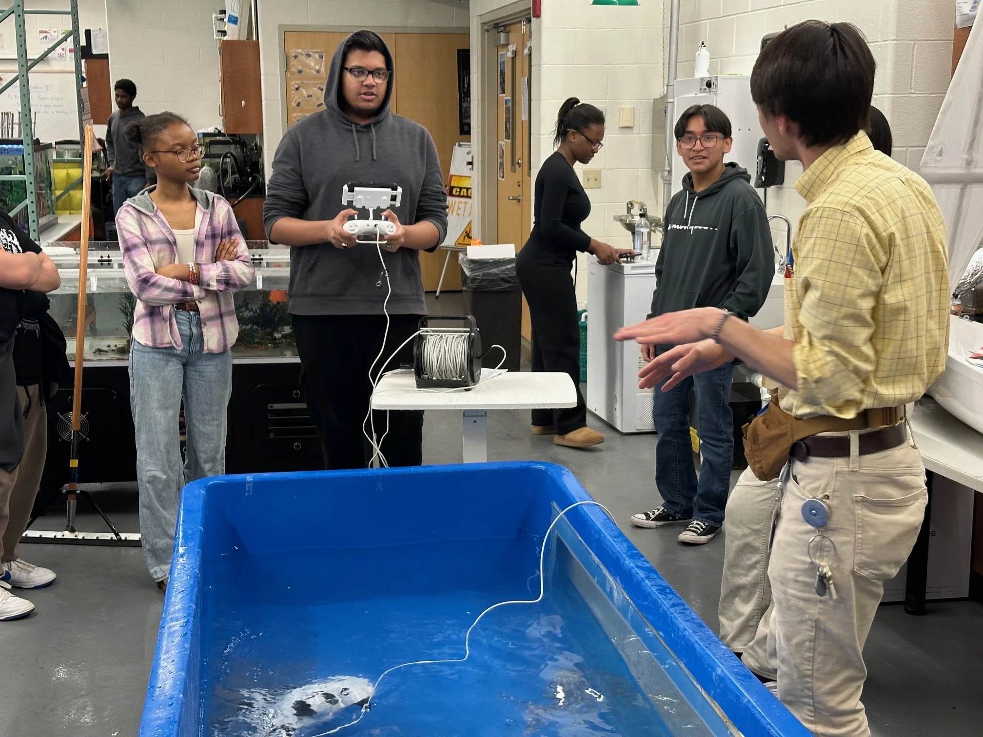 Zorabedian led students through ROV testing, demonstrating underwater maneuvering, lighting, and live video capture capabilities. The ROVs—tethered submersible robots—allowed students to gain practical experience operating underwater vehicles that are regularly used for exploration, research, and even underwater repairs in the real world.